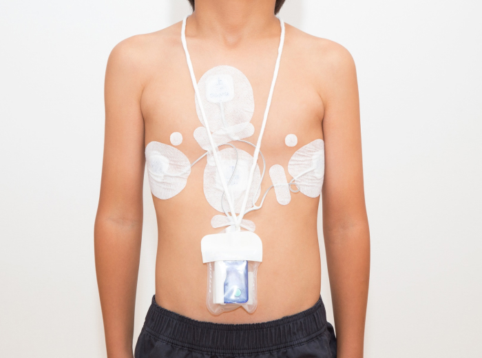 胸に小さな電極を貼り付け、専用の記録装置を装着するため、検査中も通常の生活を送ることができます。